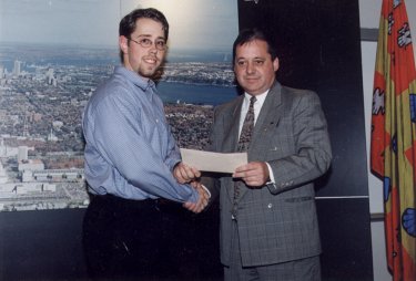 Le récipiendaire de cette année est M. Francis Simard. Il a reçu sa bourse des mains de M. Ronald Drapeau, agronome et directeur général du CIPQ inc, lors de la cérémonie de remise des bourses de l'Université Laval le 16 avril 99.