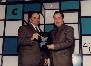 M. Laurent Pèlerin, président de l'UPA (à gauche), remet le Prix distinction 1999 à M. Ronald Drapeau (à droite) lors du Gala du mérite de l'industrie porcine du Québec tenu dans le cadre de l'Expo-congrès du porc en Avril 99. |