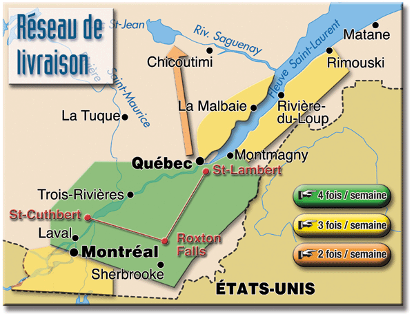 Notre réseau de distribution à la ferme couvre la grande majorité du territoire québécois. En fait, près de 95% de notre clientèle est desservie par notre réseau et 90% le sont quatre (4) jours par semaine. Les livraisons sont effectuées les lundis, mardis, jeudis et samedis. Les commandes doivent avoir été reçues avant 13 heures, le jour précédant la livraison. Pour les régions non desservies par notre réseau, nous effectuons la livraison par courrier rapide (Purolator ou DICOM).
